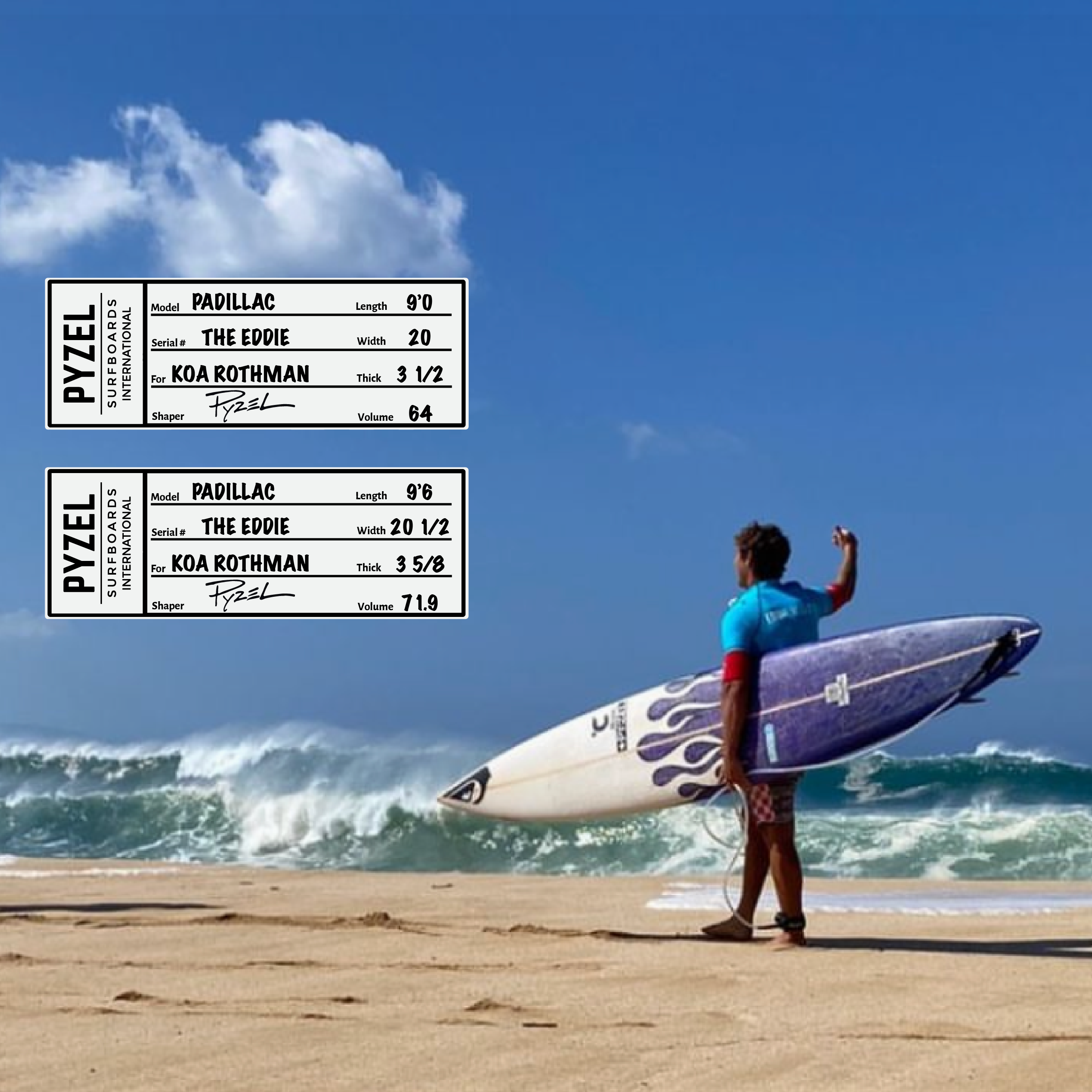 Koa rode his 9'0" Padillac in his first heat. The swell was increasing throughout the day so he swapped it out for his 9'6" in his second heat.