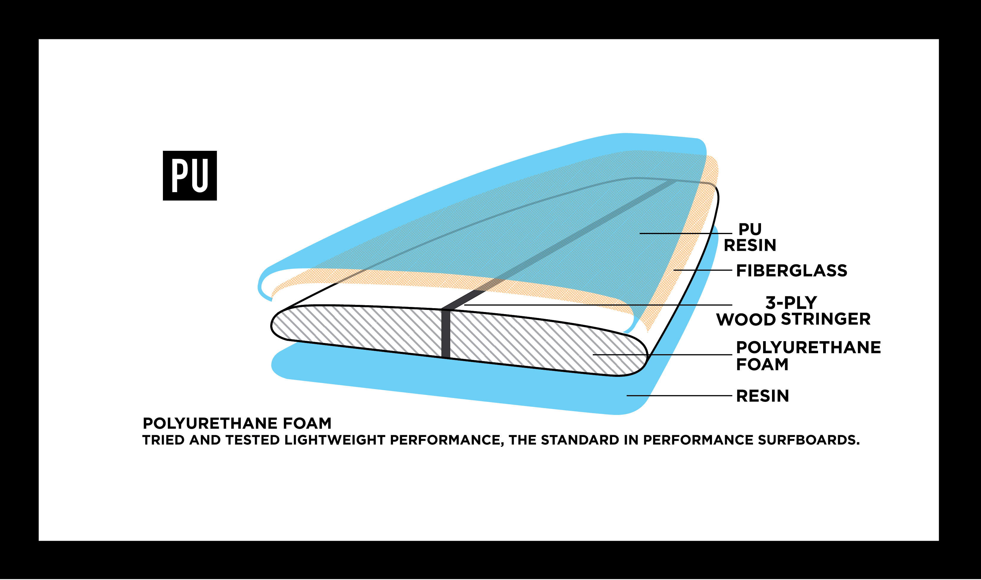 A board built in PU/PE means that we use a Polyurethane foam blank and glass it with Polyester resin. This is how the majority of today’s surfboards are built. It is how we've been making boards for years, and these materials let us make a very stable, strong, consistent, and high-performance board that has the feel that most people are used to.