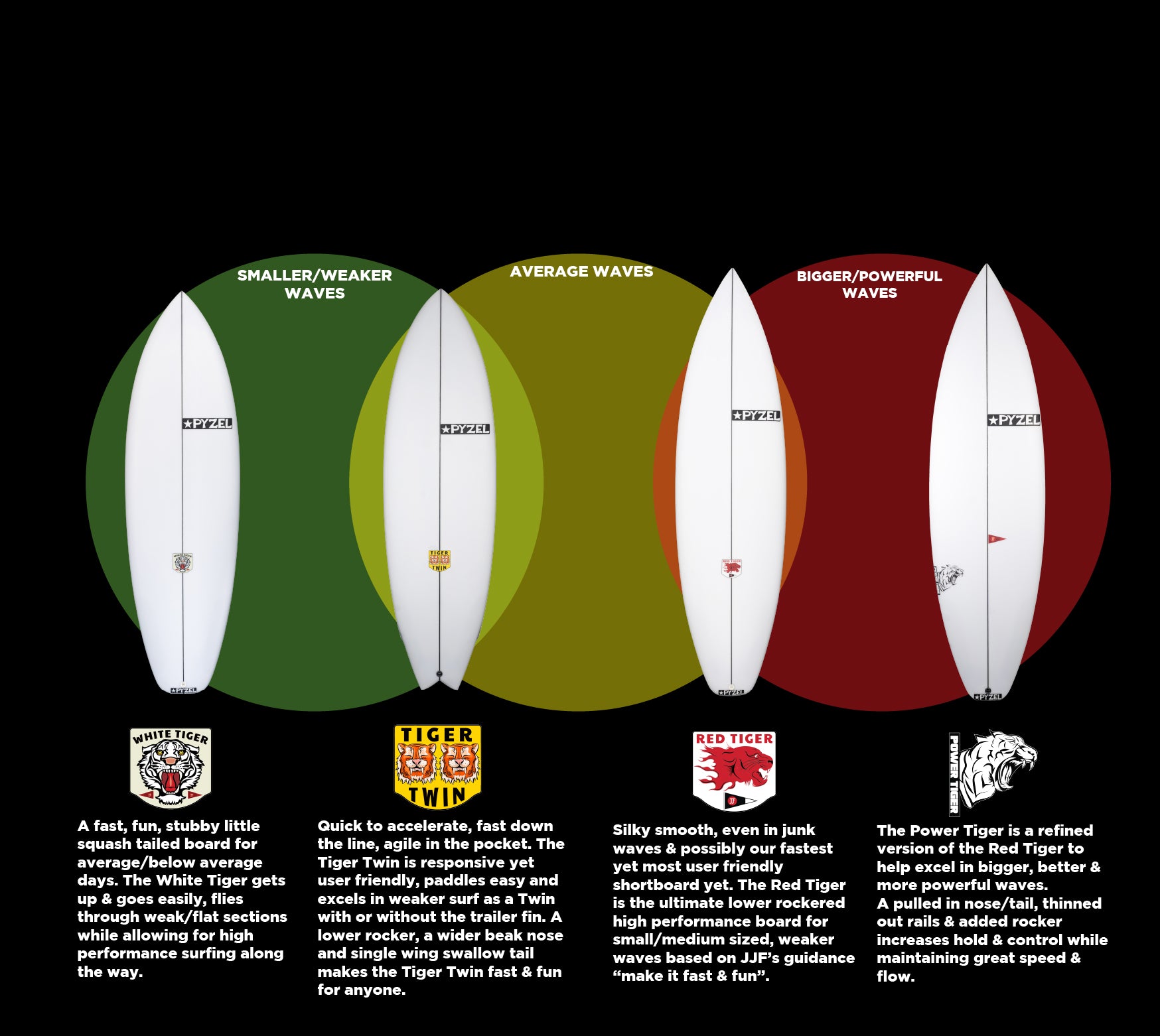 The Tiger Series is a family of boards with similarities in design, yet altered to fit different wave size/shapes and personal preferences.